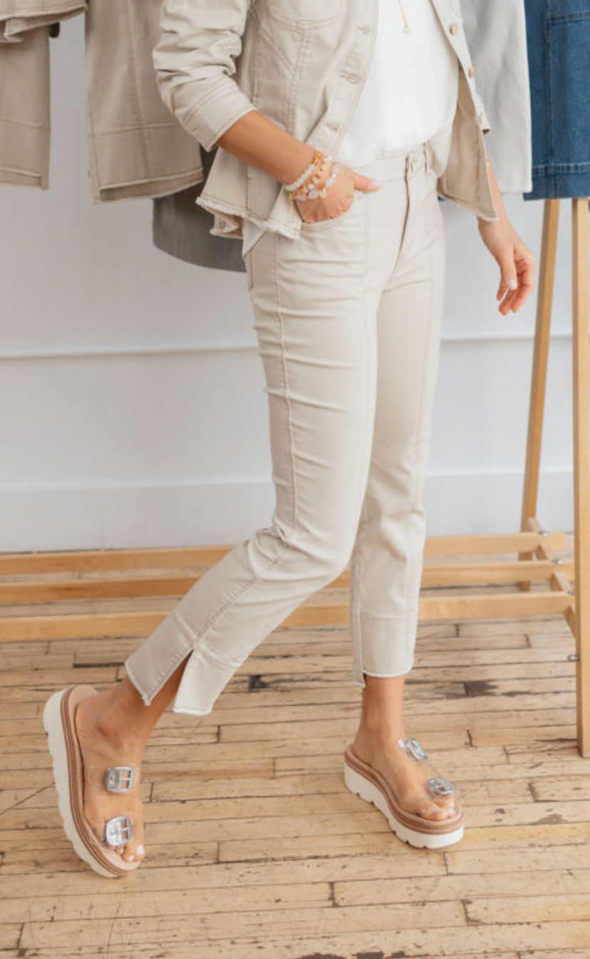 Upgrade your wardrobe with these stylish kick flare denim pants, featuring a trendy cropped silhouette and a subtle flared hem. Designed with soft, neutral-toned fabric in a birch color, they offer a clean, minimalistic look that pairs perfectly with casual or dressy outfits. The structured front seam detail adds a touch of sophistication, while the raw edge hem keeps it modern and fresh. With an inseam of 26.5", a leg opening of 16", and a rise of 9.5", these pants are both comfortable and flattering. A must-have staple for versatile styling in any season!