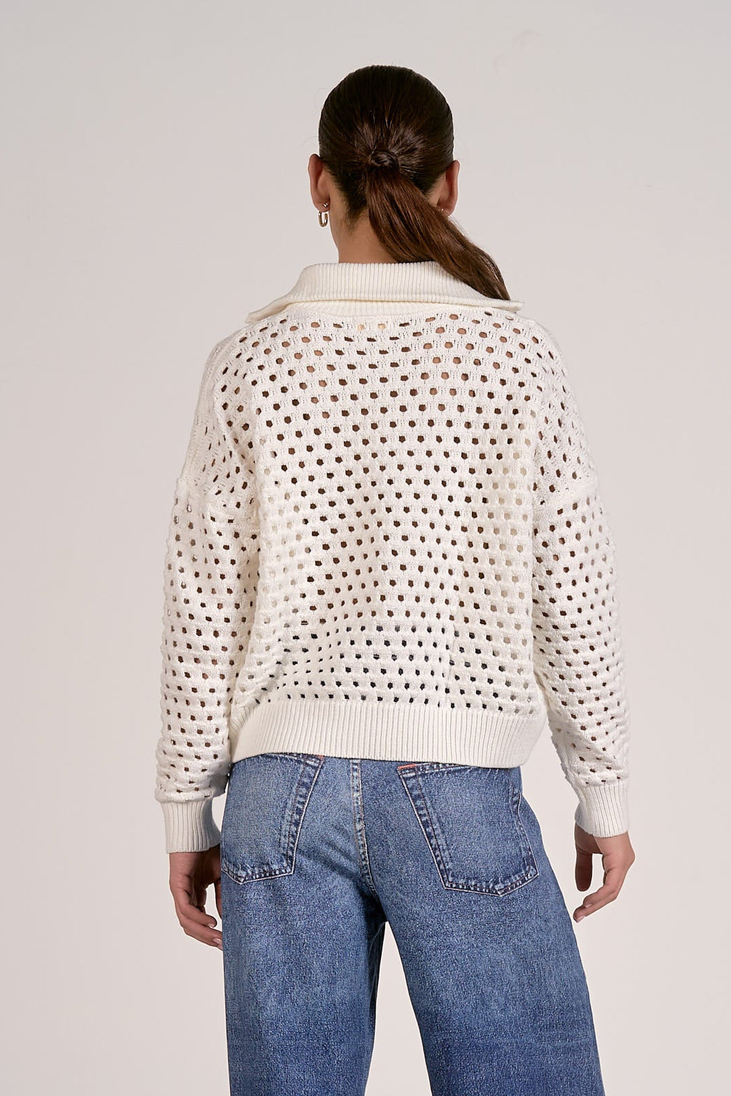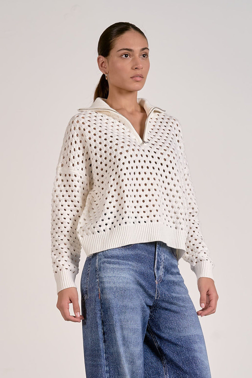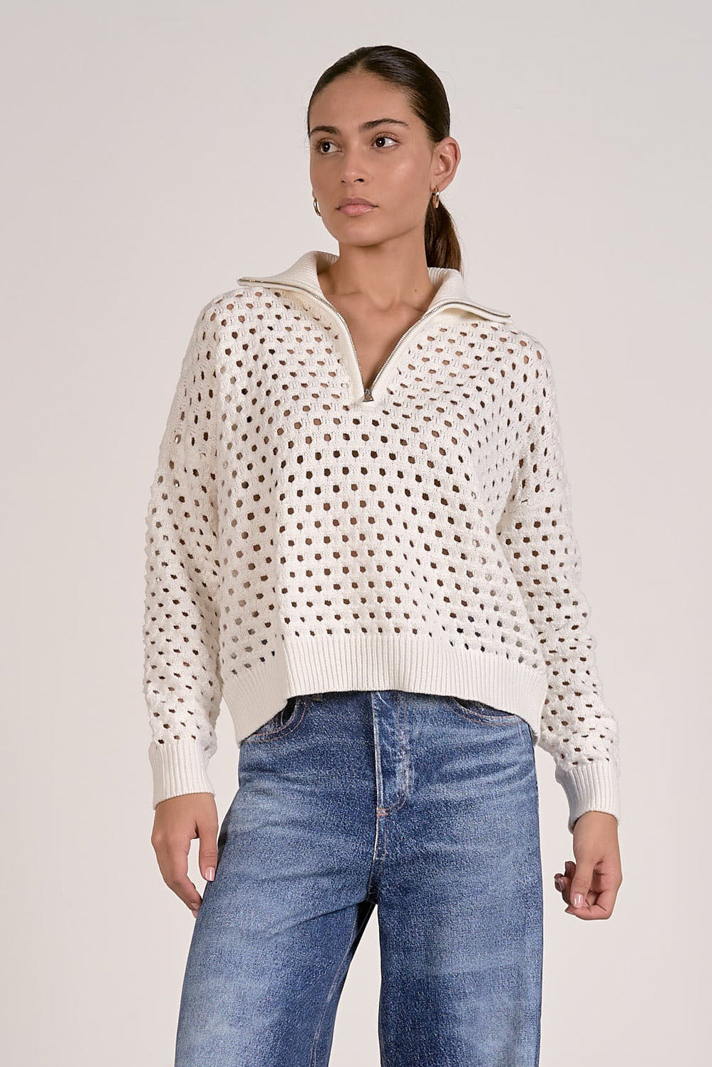 A warm neutral staple with a fresh twist, this lightweight half-zip sweater offers breathable open-knit styling and versatile layering for any season. Wear it zipped up for cozy coverage or open for enhanced airflow—perfect for transitional weather.