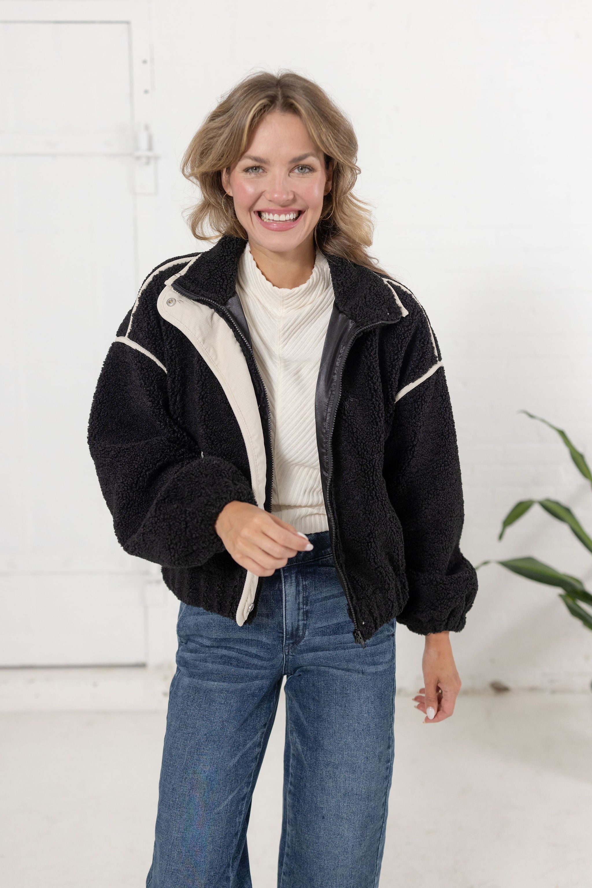 Cozy meets cool — the Sherpa Bomber Jacket brings effortless style with its plush texture and corduroy contrast trim. A fresh take on the classic bomber silhouette, it keeps you warm while giving every outfit a modern edge.