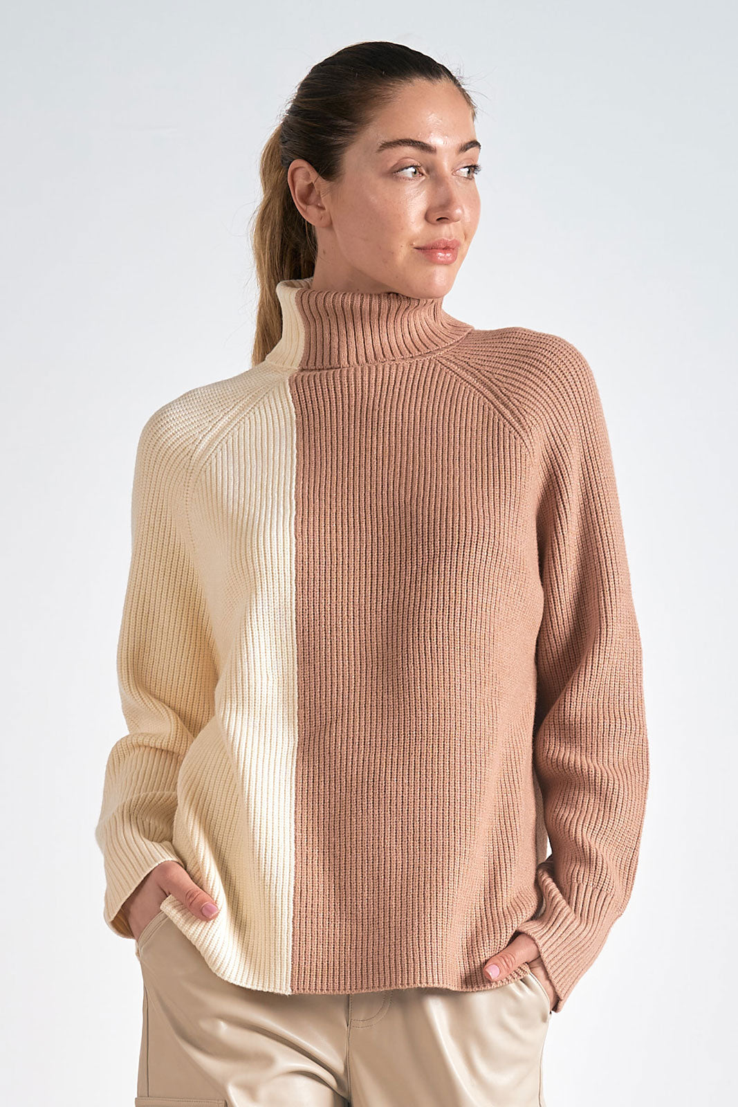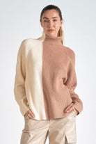 Embrace understated elegance with this colorblock turtleneck sweater, where creamy ivory meets soft beige in a thoughtfully composed design. The tonal color blocking delivers a modern, artistic sensibility while maintaining the timeless appeal of neutral tones—perfect for layering or wearing as a standalone statement piece.