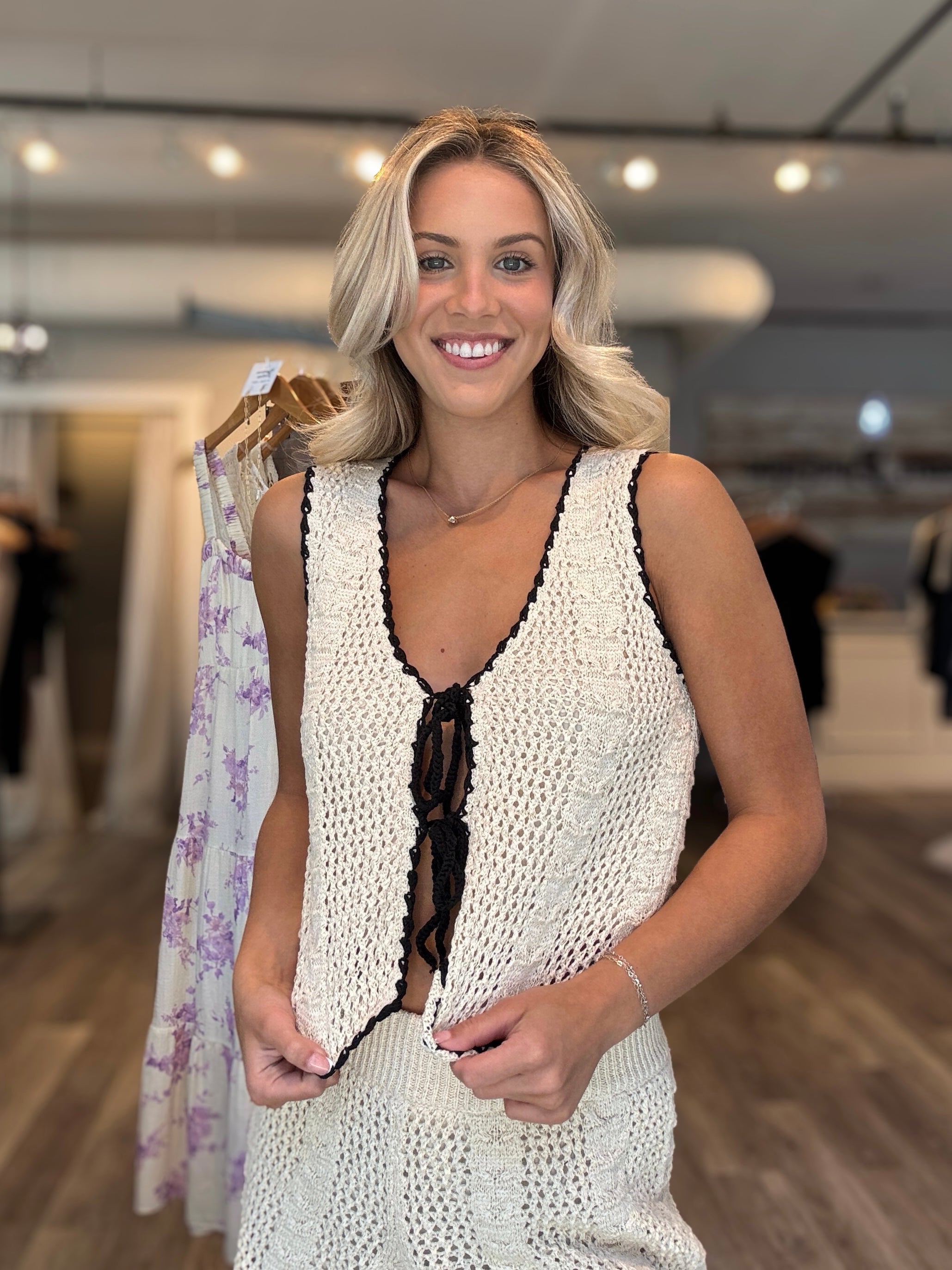 This stylish, versatile knit vest top can be worn over a dress, tank, bathing suit, or top, or on its own. The intricate detailing and playful tie-front design add a feminine, boho-chic touch to any outfit. Made of 100% cotton, this vest features a relaxed, cropped fit and a slip-on, tie-front closure. Its sleeveless design makes it the perfect layering piece for any occasion.
