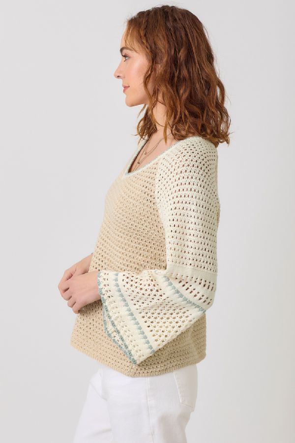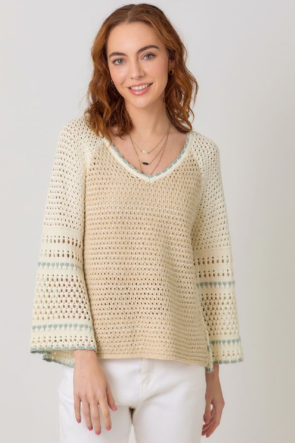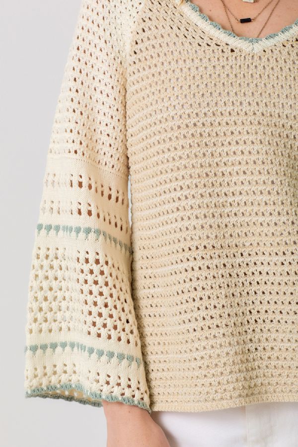 This oatmeal colored crochet sweater features a unique contrast of light sage piping on the raglan sleeves, giving it a chic and trendy look. The bell sleeves and V-neck add to the loose and comfortable fit, perfect for any casual day out.