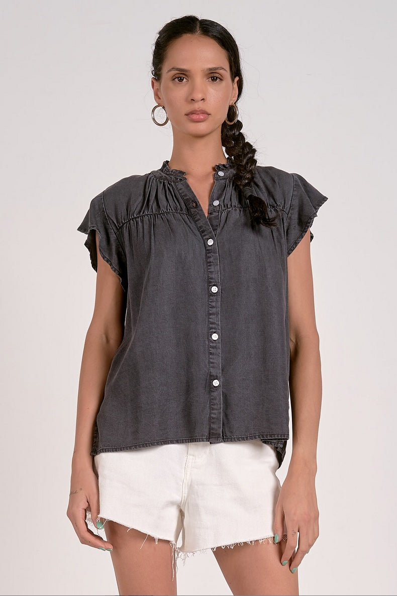 This grey button down top features stylish cap sleeves with a slight ruffle, as well as puckering on the upper chest for added detail. The front also boasts easy-to-use ivory buttons for a secure fit, making it the perfect length for any occasion.