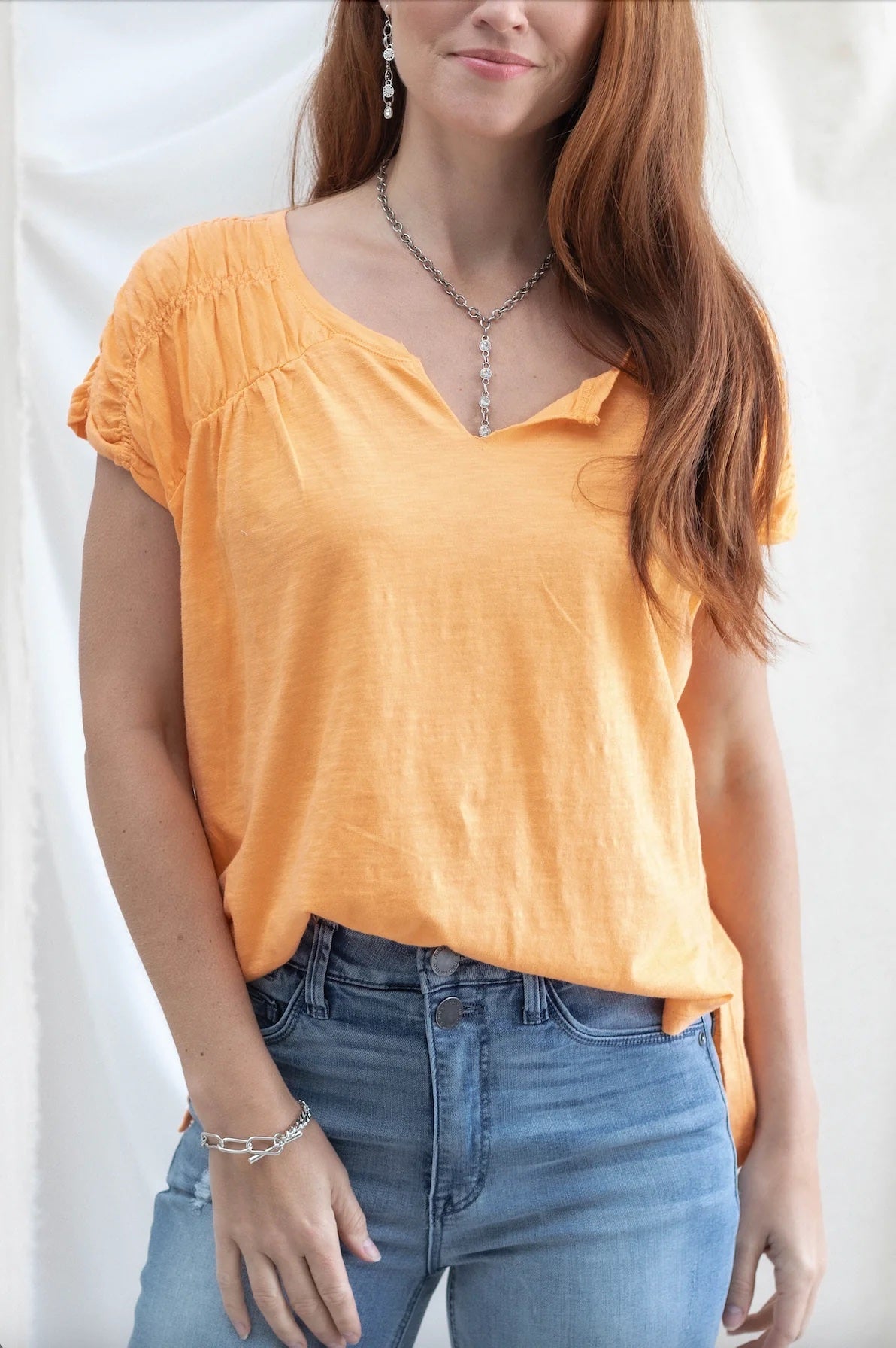 This smocked top features a smock in the shoulder fabric, and a strategically flattering design. We recommend going with your normal size.