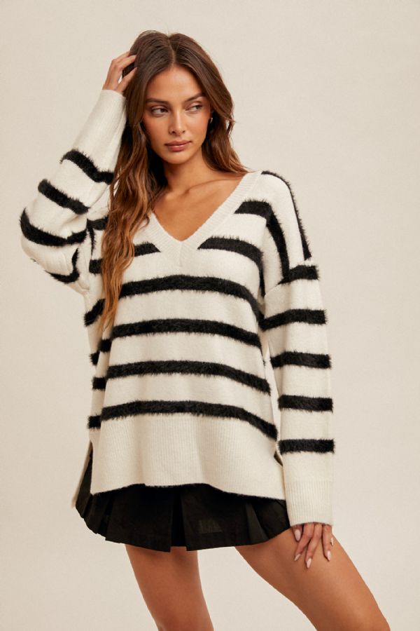 Aug 20 V-NECK STRIPE OVERSIZED SWEATER PULLOVER WITH SIDE SLIT