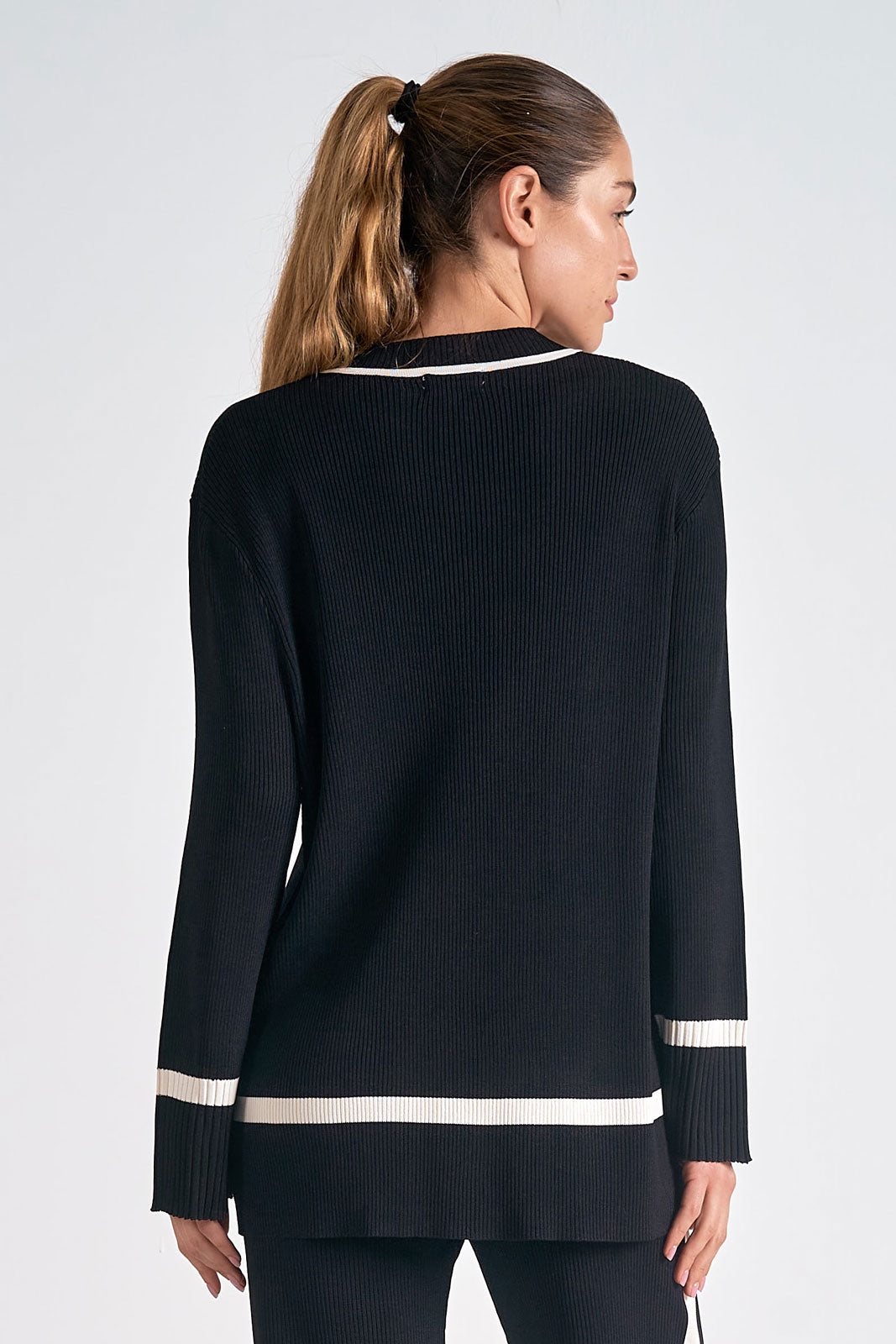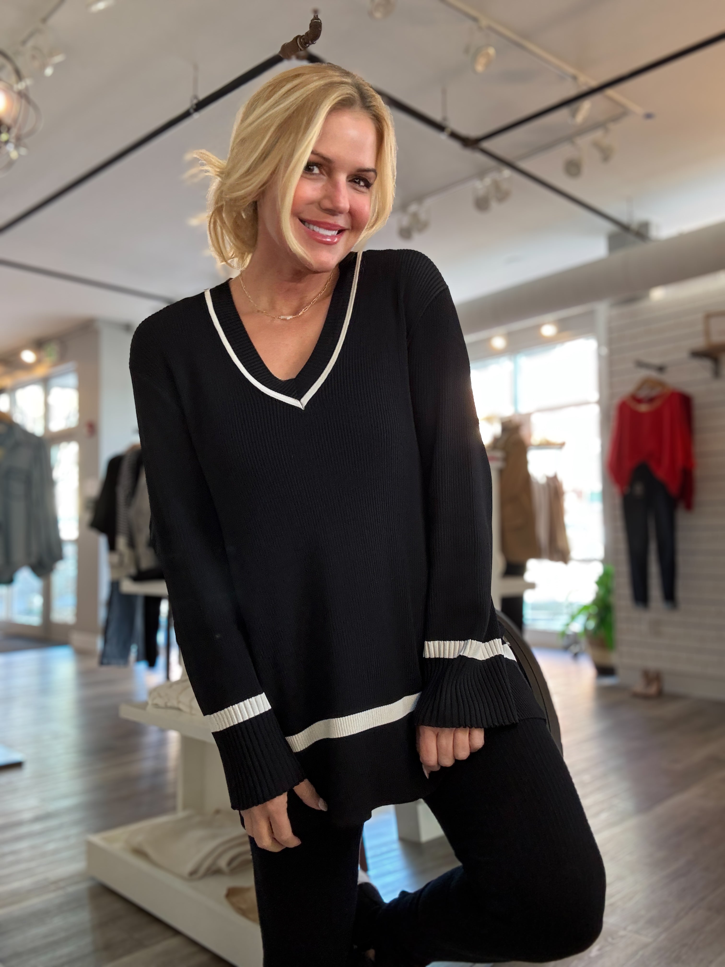 This V-neck sweater knit track top combines cozy knit fabric with a trendy ribbed pattern for a look that’s sporty yet stylish. Its relaxed fit makes it easy to wear while keeping your outfit fun and fashionable.