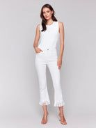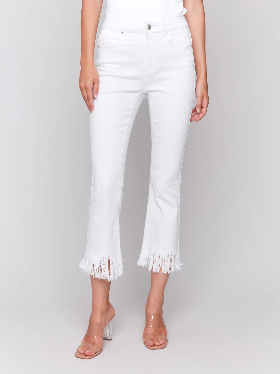 Show off your trendy side with these white cropped jeans! Crafted in a stretchy twill, they feature a stylish fringed hem. With a regular-rise waist and a bootcut silhouette, they offer a flattering fit. Versatile and chic, these jeans can easily be dressed up or down for spring and summer.